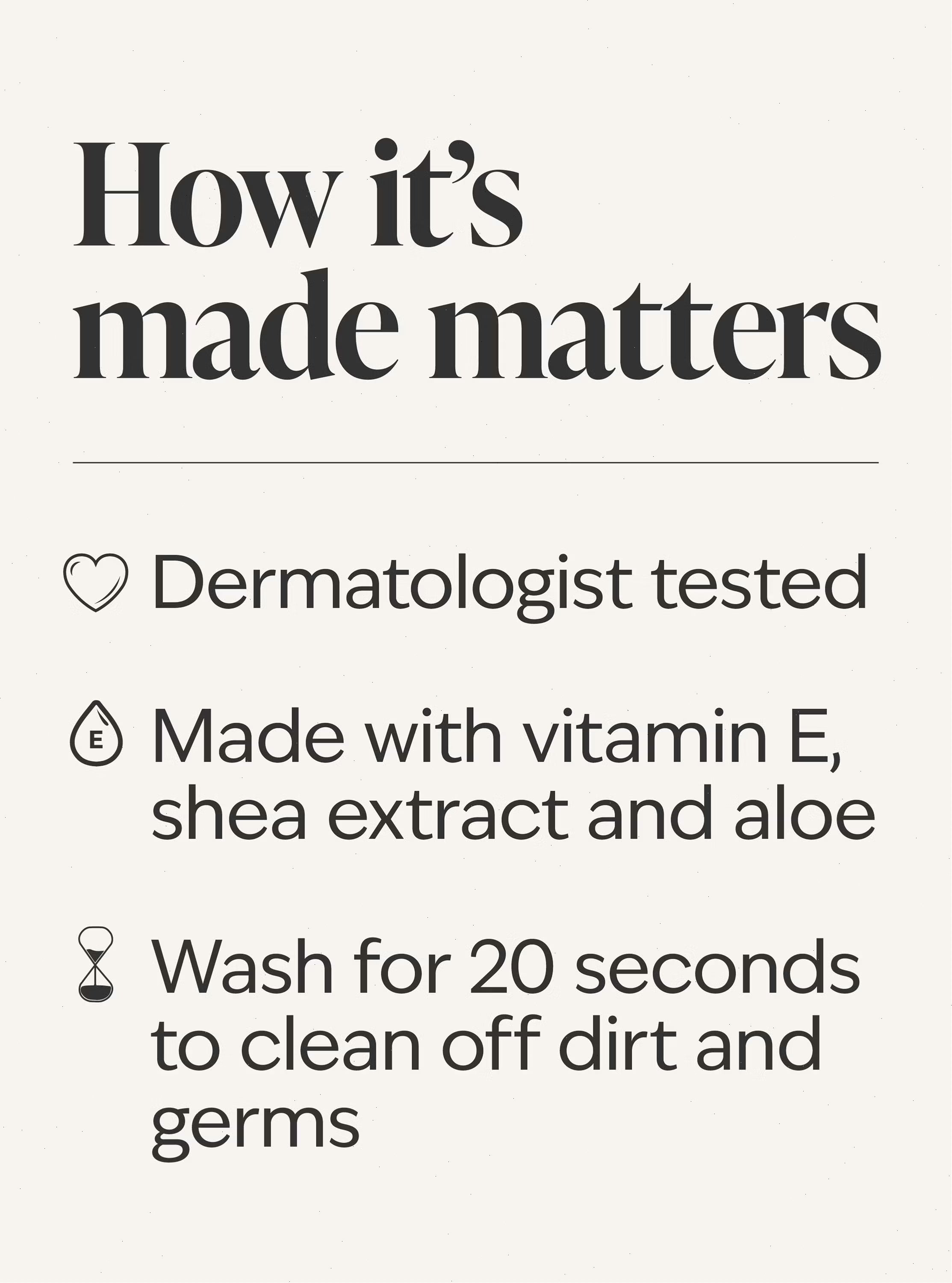 What it does: washes away germs and helps skin feel smooth and moisturized.